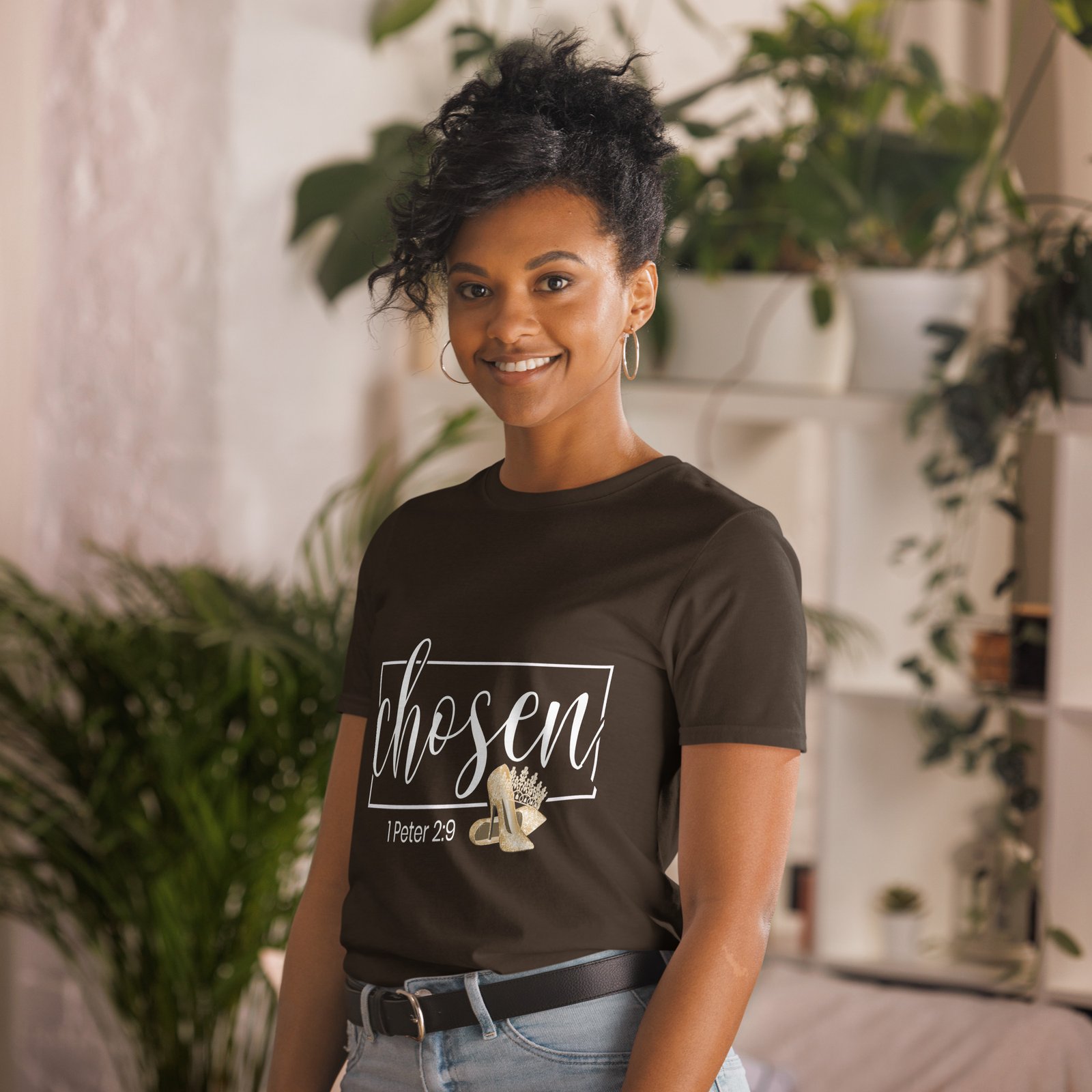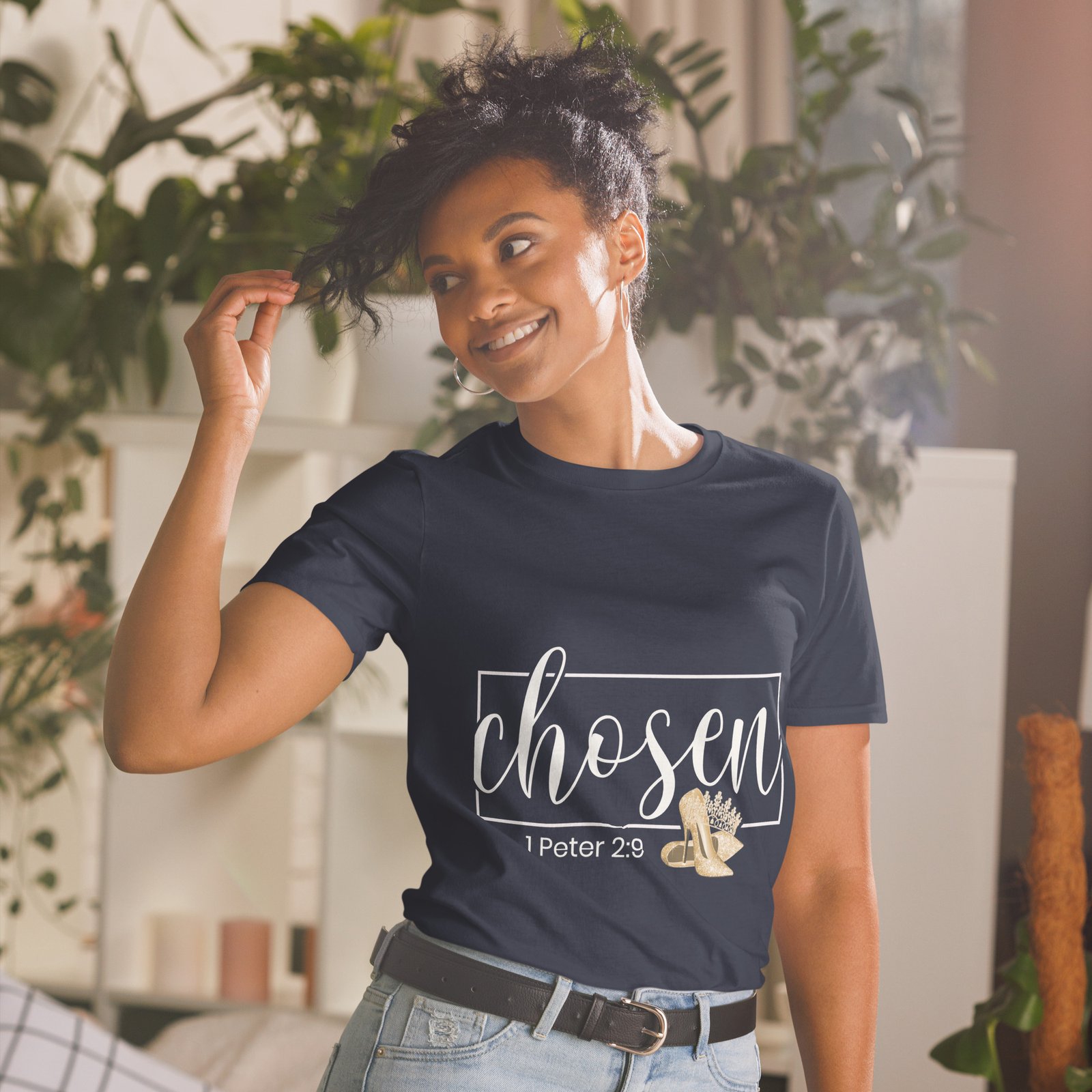 Step into your divine identity with our “Chosen” t-shirt, inspired by 1 Peter 2:9 — “You are a chosen generation, a royal priesthood…”